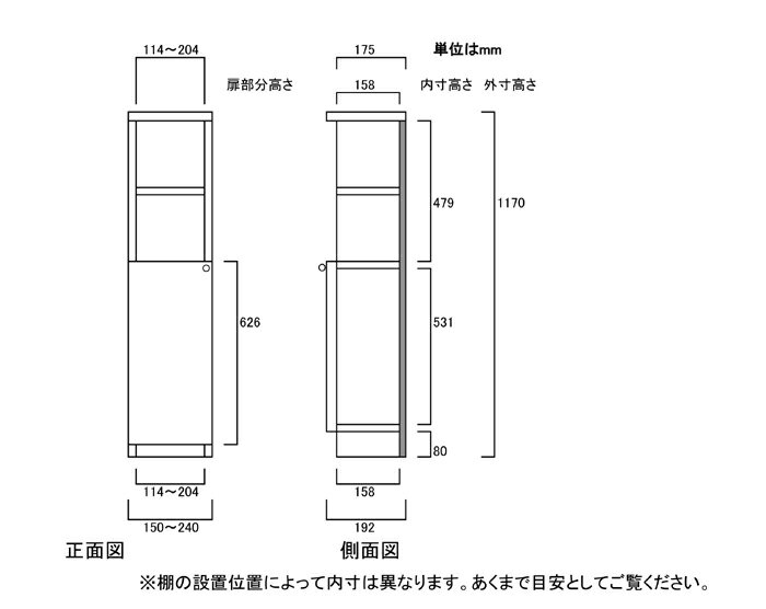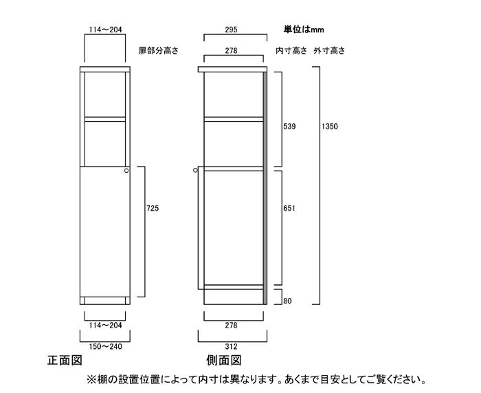 下部扉リビング隙間収納高さ149.9cm幅15〜24cm奥行46cm片開き 扉高さ72.5cm 扉付サニタリ家具 リビング隙間収納