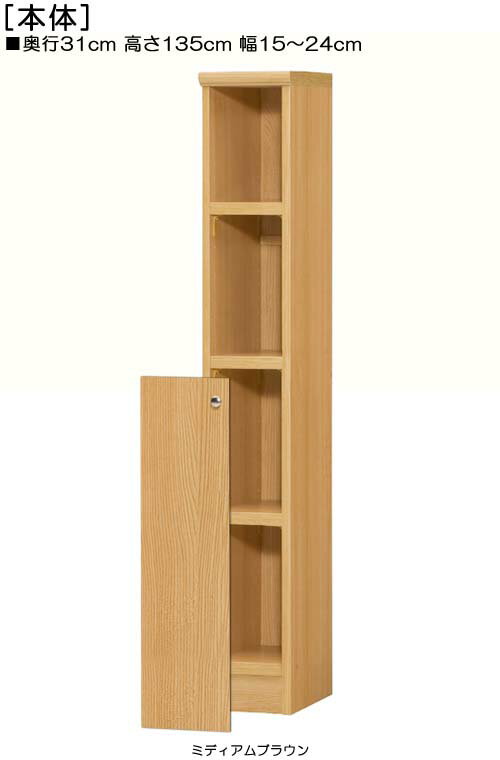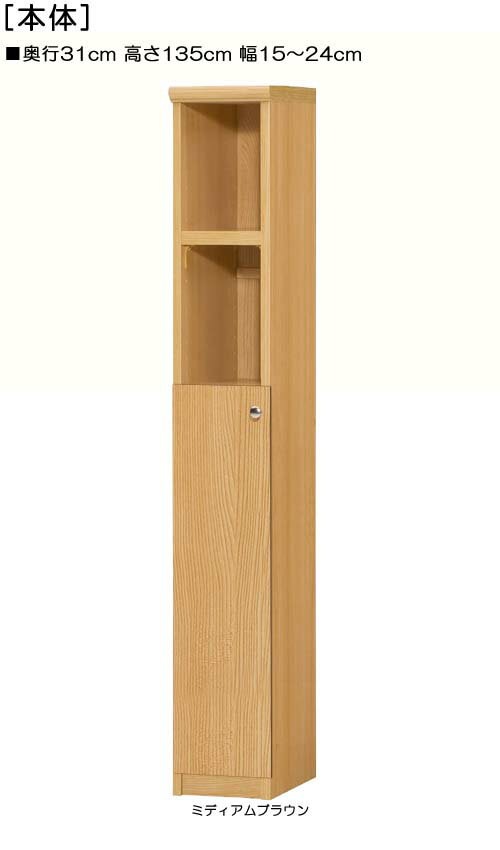 扉付リビング隙間収納高さ135cm幅15〜24cm奥行31cm厚棚板(棚板厚み2.5cm)片開き 扉高さ72.5cm 扉付サニタリ本棚 リビング隙間収納