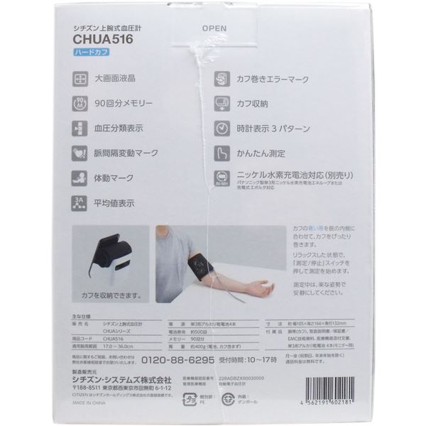 シチズン上腕式血圧計 ハードカフ CHUA-516腕にフィットしやすい、やさしい肌触りのハードカフ。