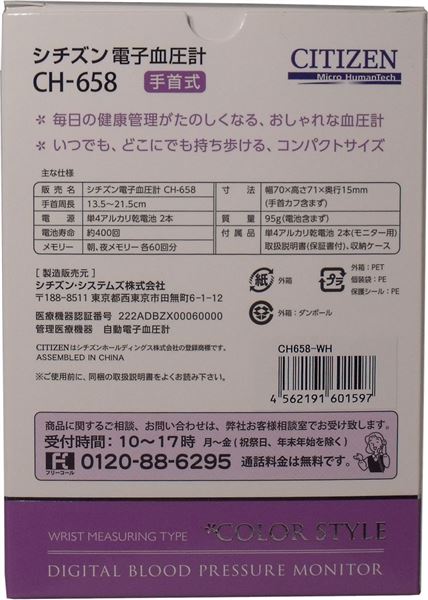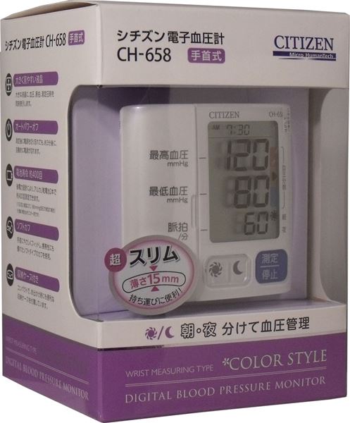 シチズン電子血圧計 手首式 CH-658商品区分:管理医療機器 (管理)(医療機器届出番号:222ADBZX00060000)●毎日の健康管理がたのしくなる、おしゃれな血圧計●いつでも、どこにでも持ち歩ける、コンパクトサイズ●大きく見やすい液晶大きな液晶に、血圧、脈拍、測定日時を同時表示します。