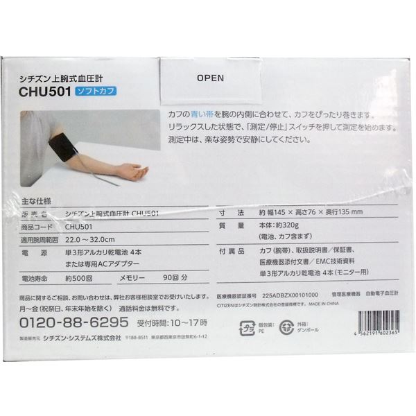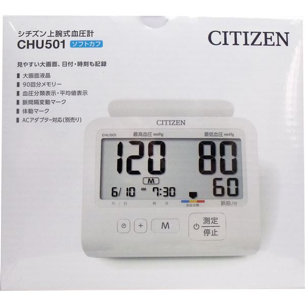 シチズン上腕式血圧計 ソフトカフ CHU501商品区分:管理医療機器測定値がみやすい大画面モデル!大画面液晶に見やすい表示操作性の良い大きな測定ボタン●測定値を90回分メモリー最高血圧値、最低血圧値、脈拍数を日付、時刻とともに90回分メモリーします。