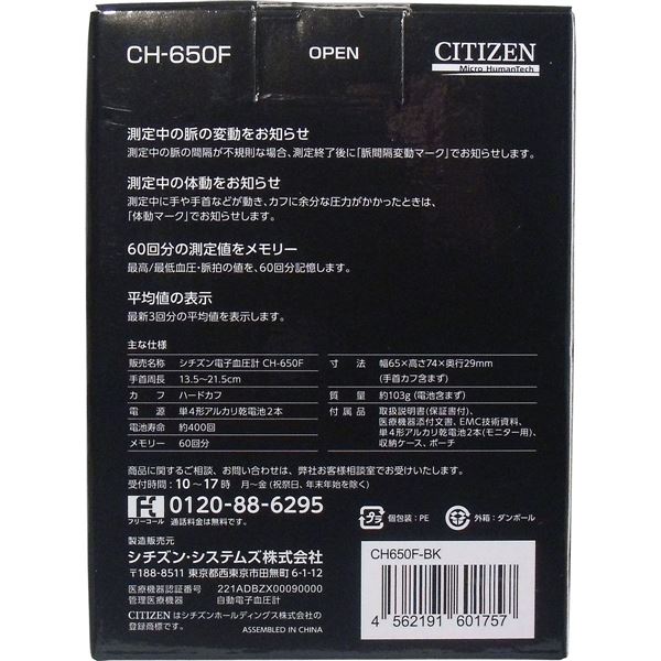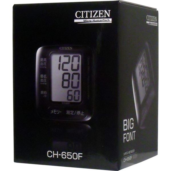 シチズン電子血圧計 手首式 CH-650F ブラック商品区分:管理医療機器 (管理)(医療機器認証番号:221ADBZX00090000)●測定値を60回分メモリー(最高血圧値、最低血圧時、脈拍数)●測定値の最新3回分の平均値を表示●測定中の体動を体動マークでお知らせ●不規則な脈間隔を脈間隔変動マークでお知らせ●測定時に装着しやすいハードカフを採用●手首周長13.5cmー21.5cmに対応●大きく見やすい液晶表示●携帯に便利な収納ケース・ポーチ付き【使用方法】・2ステップでカンタン測定!(ご使用の前に電池を入れます。