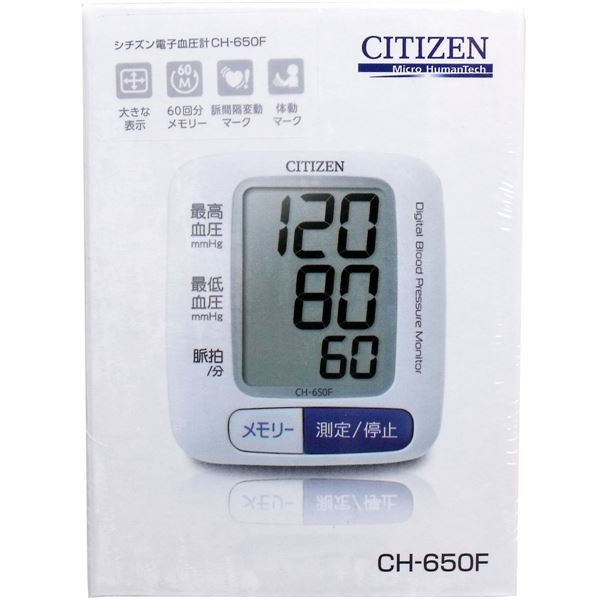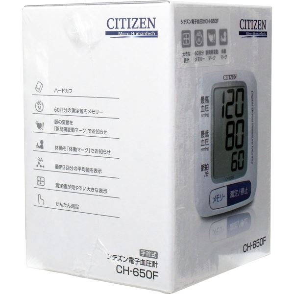 シチズン電子血圧計 手首式 CH-650F商品区分:管理医療機器 (管理)(医療機器届出番号:221ADBZX00090000)●測定値を60回分メモリー●測定値の最新3回分の平均値を表示●測定中の体動を体動マークでお知らせ●不規則な脈間隔を脈間隔変動マークでお知らせ●ハードカフで手首周長13.5cmー21.5cmに対応●大きく見やすい液晶表示●収納ケース付き【規格概要】測定方式・・・オシロメトリック法カフ・・・ハードカフ手首周長・・・13.5ー21.5cm表示方式・・・デジタル表示測定範囲・・・圧力0ー280mmHg、目量1mmHg、脈拍40ー180拍/分測定精度・・・圧力±3mmHg、脈拍数±5%加圧・・・ポンプによる自動加圧減圧・・・電磁弁による自動排気定格および電源・・・DC3V、単4アルカリ乾電池2本電池寿命・・・約400回 ※モニター電池をのぞく(1日1回、室温22度、180mmHg加圧で測定の場合)メモリー・・・60回分 質量・・・約103g(電池含まず)寸法・・・約65(幅)X74(高さ)X29(奥行き)mm(手首カフ含まず)使用環境温湿度・・・10ー40度、30ー85%保管環境温湿度・・・-20ー60度、10ー95%付属品・・・取扱説明書(保証書付)、モニター用電池、収納ケース【注意事項】・乳幼児や意思表示ができない方へのご使用はおやめください。